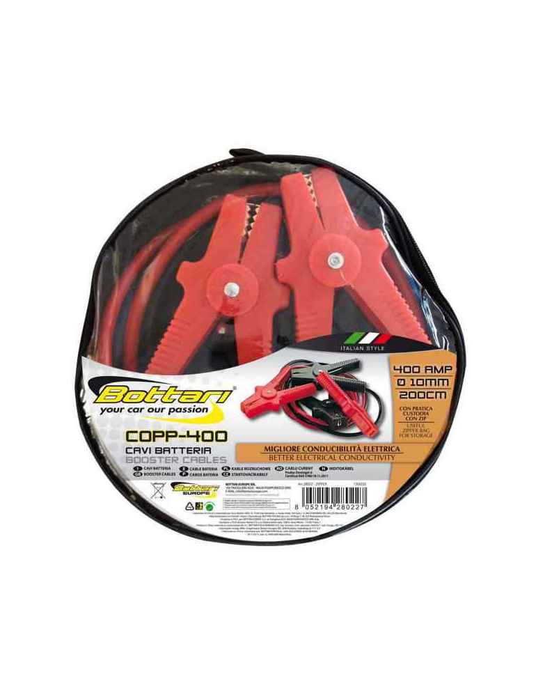 BOTTARIPinzas de batería COPP-400 con una capacidad de 400A, cable de 2 metros de longitud y 10mm de diámetro. Ideales para uso en automóviles y vehículos de tamaño medio.