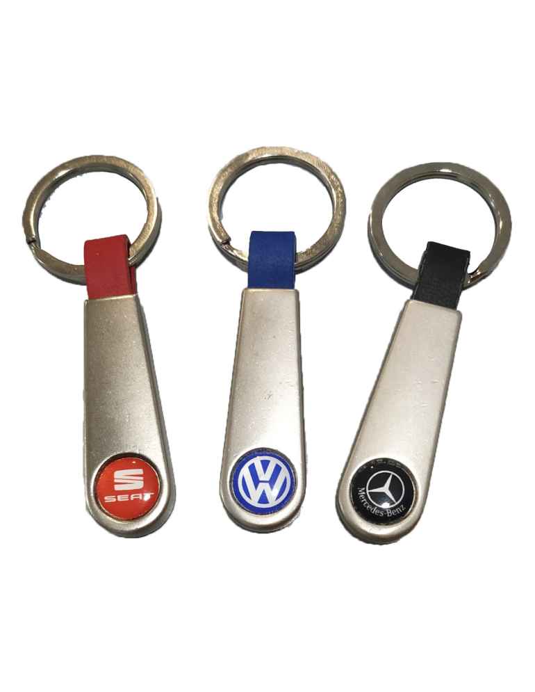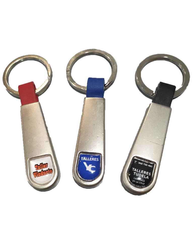 CantelarLlavero de piel con placa metálica personalizable en resina. Disponible en tres colores (rojo, azul y negro). Ideal para promociones y empresas.