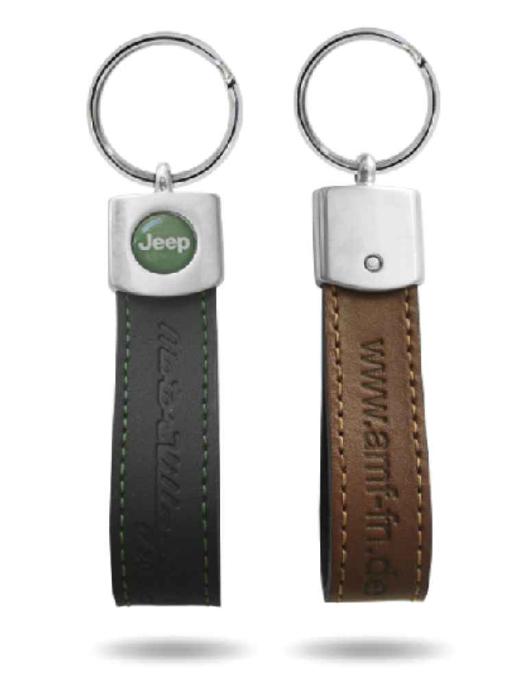 Llavero de piel de alta calidad con personalización termograbada y detalle en resina. Diseño exclusivo y elegante para empresas y promociones.
