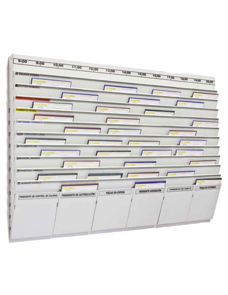 CantelarPlanificador de trabajo con casilleros de incidencias, ideal para organizar y gestionar múltiples procesos de manera eficiente.